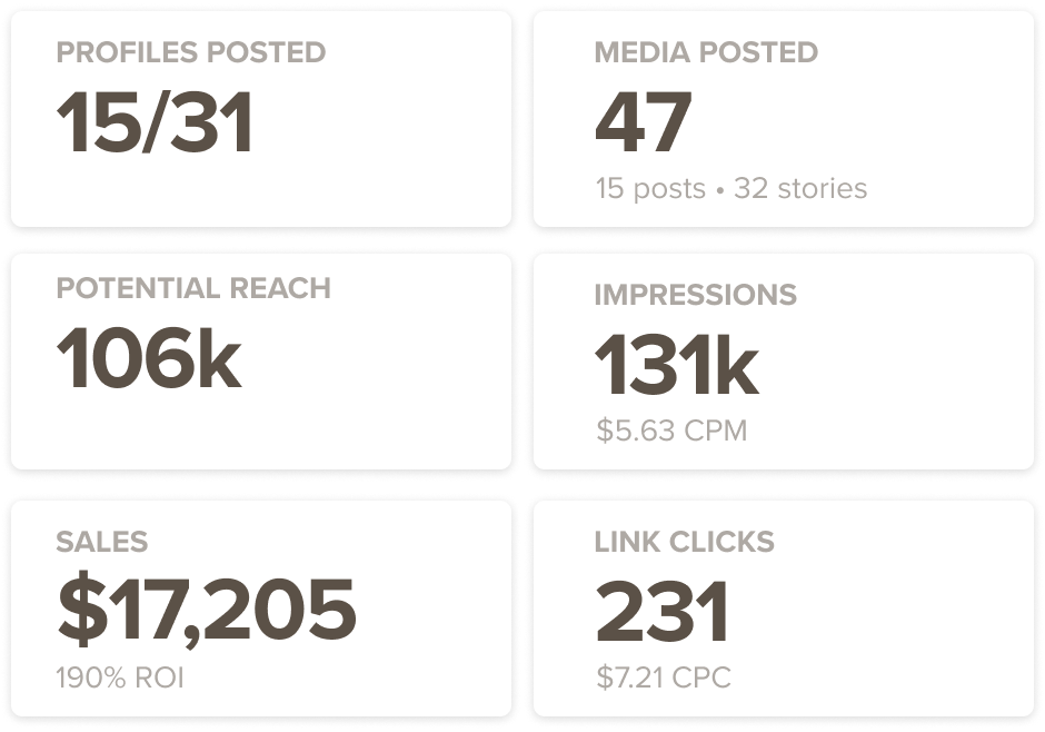 Don't spend 1-2 days gathering all of the impressions and reach data on stories or posts. We automate that so your team can spend more time on other parts of the business or on improving your campaigns.
