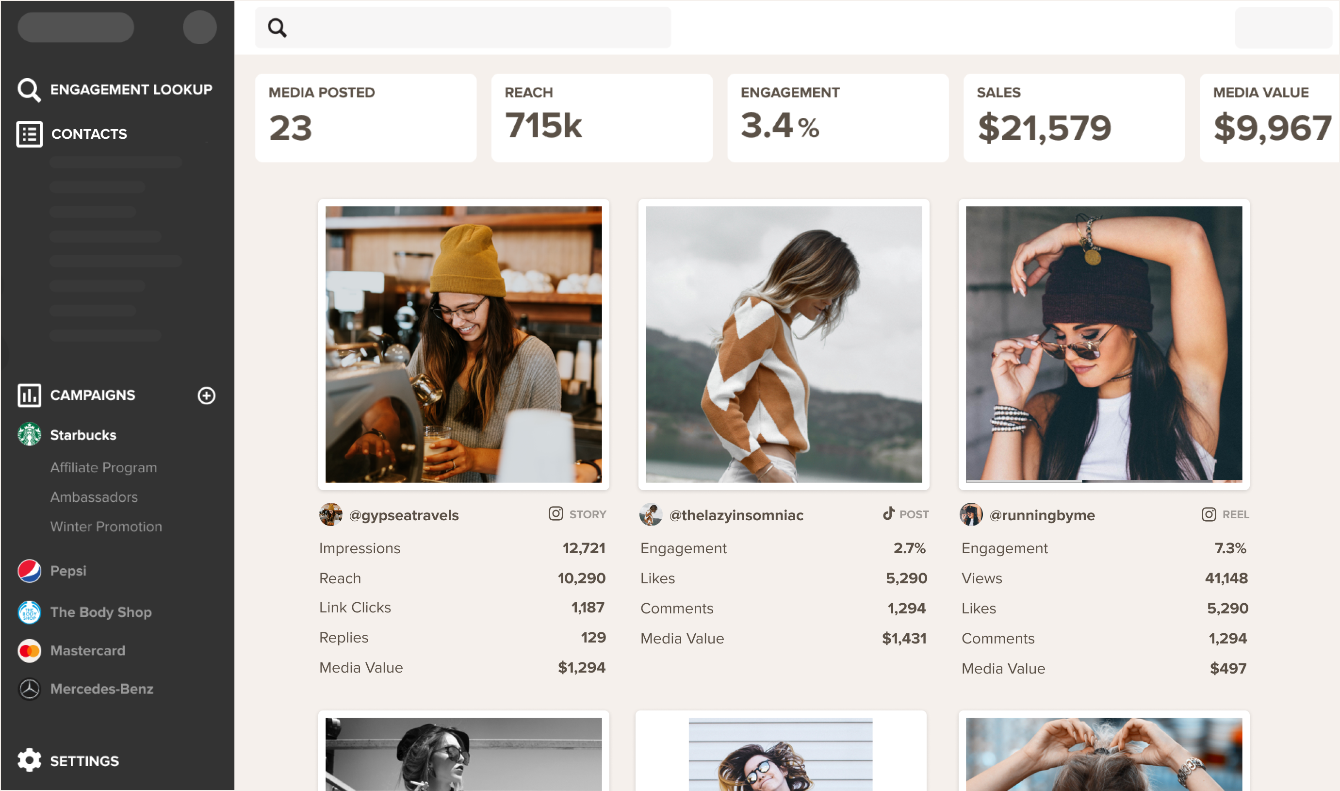 You can use MightyScout for influencer campaigns on Instagram, TikTok, and YouTube. This includes Instagram stories, Reels, posts, TikToks, and YouTube videos. We cover things like impressions, reach, saves, shares, actions taken, link clicks, sales, CPM, media value, and more. We continue to expand into different platforms on an on-going basis.